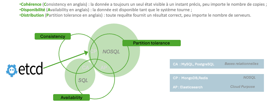 Selon le théorème de CAP, dans toute base de données, vous ne pouvez respecter au plus que 2 propriétés parmi la cohérence, la disponibilité et la distribution.
