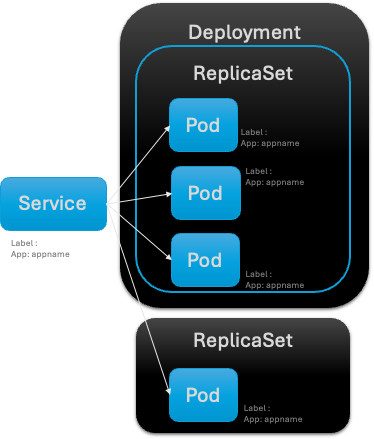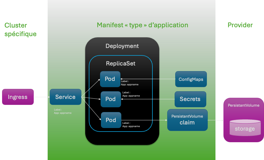 Le service se bind sur le « contrat » d’exécution, le ReplicaSet par un matchSelector, ex : Tout les Pod qui on App == appname