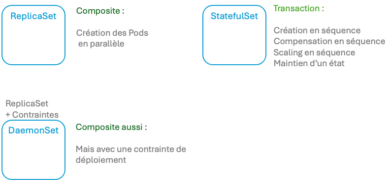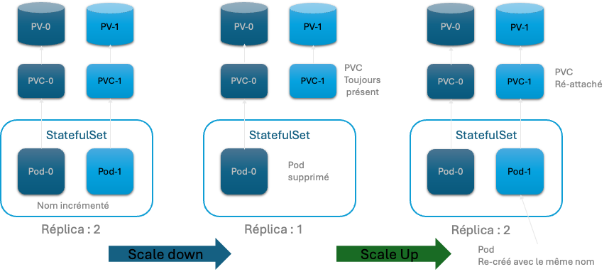 Contrairement à un déployment, un StatefulSet conserve une identité persistante pour chacun de ses pods. Les pods d’un StatefulSet sont créés à partir de la même spécification, mais ne sont pas interchangeables : chacun a un identifiant persistant qu’il conserve lors de toute reconstruction.