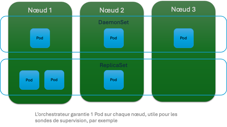 Le DaemonSet est utilisé pour le déploiement, comme son nom l’indique d’un daemon. Il va lancer une instance unique de pod sur chacun des workers nodes du cluster Kubernetes. En cas d’ajout d’un worker node, le controle plane de Kubernetes va programmer l’ajout d’un Pod pour ce DaemonSet sur ce nouveau noeud.